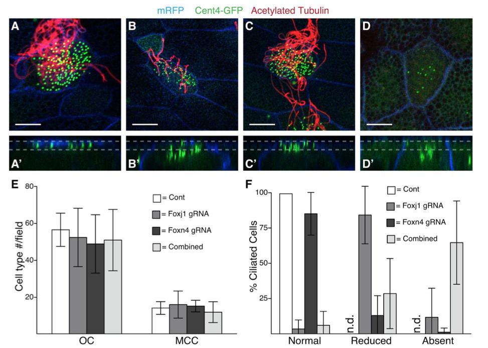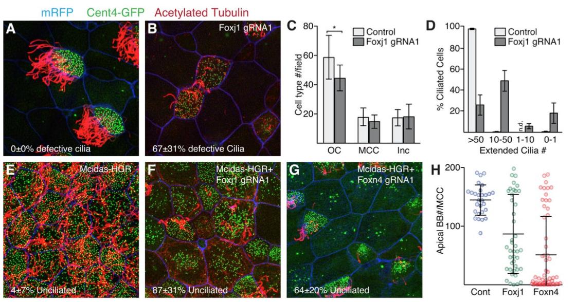 mm field based on data from â¥12 embryos. Error bars indicate s.d. *P<0.05. (D) The percentage of MCCs extending >50, 10-50, 1-10 and 0 cilia in control and Cas9/Foxj1gRNA1-injected embryos based on scoring â¥147 cells from eight to ten embryos. Error bars indicate s.d. n.d., not detected. (E-G) Confocal images of the skin of wild-type (E), Cas9/Foxj1gRNA1-injected (F) or Cas9/Foxn4gRNA1-injected (G) embryos, further injected with RNAs encoding Multicilin-HGR, mRFP (blue) or Centrin4-GFP (green). At stage 11.5, Multicilin activity was induced by treatment with Dex, and embryos were fixed at stage 26 and stained for cilia (red). The percentage of MCCs with cilia extension defects is indicated (±s.d.). (H) Scatter plot showing basal body number located within 1â