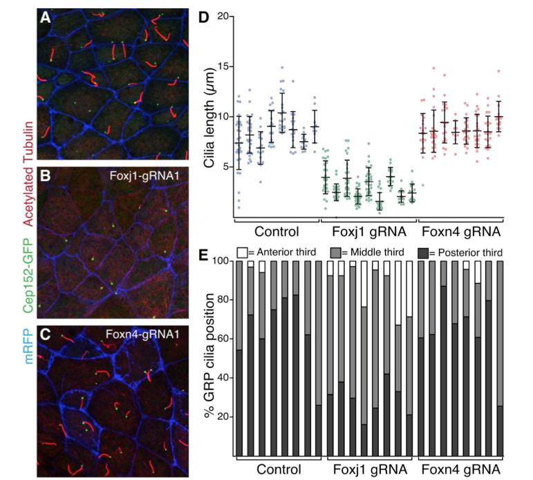 GRP cilia formation in foxn4 and foxj1 mutant embryos. (A-C) Embryos were injected with Foxj1gRNA1 or Foxn4gRNA1 along with Cas9 protein, followed by RNA encoding mRFP (blue) or Cep152-GFP (green) to label membranes and centrioles, respectively. At stage 17/18, the dorsal tissue was dissected away to expose the GRP, fixed, stained for cilia (red) and imaged by confocal microscopy. Typical confocal images are shown of GRP cells in control (A), Cas9/Foxj1gRNA1-injected (B) or Cas9/Foxn4gRNA1-injected (C) embryos. Anterior is up. (D) Scatter plot showing length of GRP cilia in cells from individual embryos injected as indicated. Mean and s.d. are indicated. (E) Cilia positioning in cells along the anteroposterior axis in the GRP was measured in embryos injected as indicated. Each bar shows data from individual GRPs based on data obtained from 10-30 cells, with the percentage of cells with cilia located in the anterior, middle or posterior third indicated. Most GRP cells have a posteriorly localized cilium in control (69±11%) and Cas9/Foxn4gRNA1-injected (69±9%) embryos, but not in Cas9/Foxj1gRNA1-injected embryos (29±9%; P=9Ã10â7).