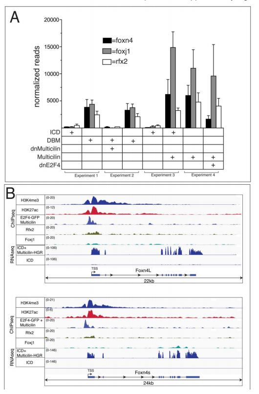 Foxn4 binding in MCC promoters. ChIPseq analysis was carried out on a GFP-tagged form of Foxn4 expressed in epithelial progenitors along with Multicilin to induce MCC differentiation. Sequence reads obtained in this analysis were compared with that previously obtained for Rfx2 (Chung et al., 2014), E2f4 (Ma et al., 2014) or Foxj1 and various chromatin marks (Quigley and Kintner, 2016 preprint). (A) Genome browser screenshot of the rfx2 promoter along with tag counts obtained in ChIPseq analysis of Foxn4, Rfx2, Foxj1 and chromatin marks as indicated. (B) The binding of different MCC transcription factors to the promoters of 950 genes that are markedly upregulated during MCC differentiation, based on previous extensive RNAseq analyses of skin progenitors (Quigley and Kintner, 2016 preprint). (C) Tag counts of Foxn4 and Foxj1 ChIPseq at all sites (gray) and all core MCC promoters (red) bound by either.