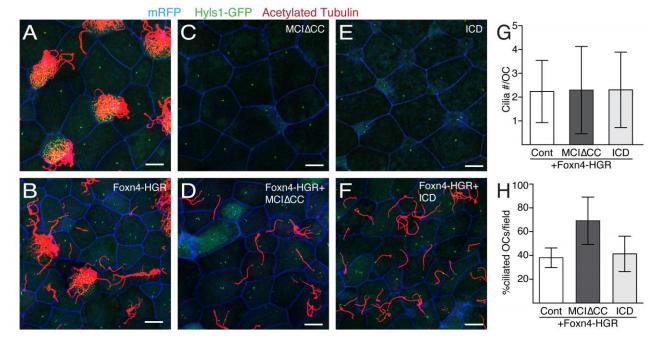repressed using activated Notch (ICD) or induced ectopically using Multicilin as described in