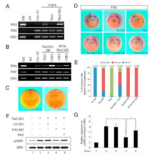 Tbx2 down-regulates FGF signaling by repressing Flrt3 expression. (A, B) Four-cell stage embryos were injected in the animal pole region as indicated with FGF8 (1 ng), Tbx2(200 pg), Tbx2 MO (10 ng), Tbx2δC-GR (200 pg) andVP16-Tbx2-GR (200 pg), and animal cap explants were dissected at stage 9, cultured until stage 12 in the absence or presence of dexamethasone (DEX; 10 μM) as indicated and then subjected to RT-PCR analysis. (C) Double in situ hybridization comparing the expression pattern of Tbx2 (red) with that of Flrt3 or Flrt2 (purple) in mid-neurulae. (D) Flrt3 expression in embryos injected dorso-animally with Tbx2 (200 pg), Tbx2 MO (10 ng), Tbx2δC-GR (200 pg) and VP16-Tbx2-GR (200 pg) as indicated. Embryos injected with Tbx2δC-GR or VP16-Tbx2-GR were treated with DEX from stage 12â17. Arrowheads denote expansion of Flrt3 expression. In (C) and (D), embryos are shown in anterior view with dorsal to the top. (E) Quantification of the experiments shown in (D). (F) VMZ explants from the embryos injected ventrally with Tbx2 MO (30 ng), CO MO (30 ng), Flrt3 MO (30 ng) and Flrt3 (200 pg) as indicated were subjected to western blotting. (G) Quantification of the levels of p-ERK (normalized to ERK) from three independent experiments for (F). Error bars indicate the standard error (SE). *p-value <0.05. (For interpretation of the references to color in this figure legend, the reader is referred to the web version of this article.)