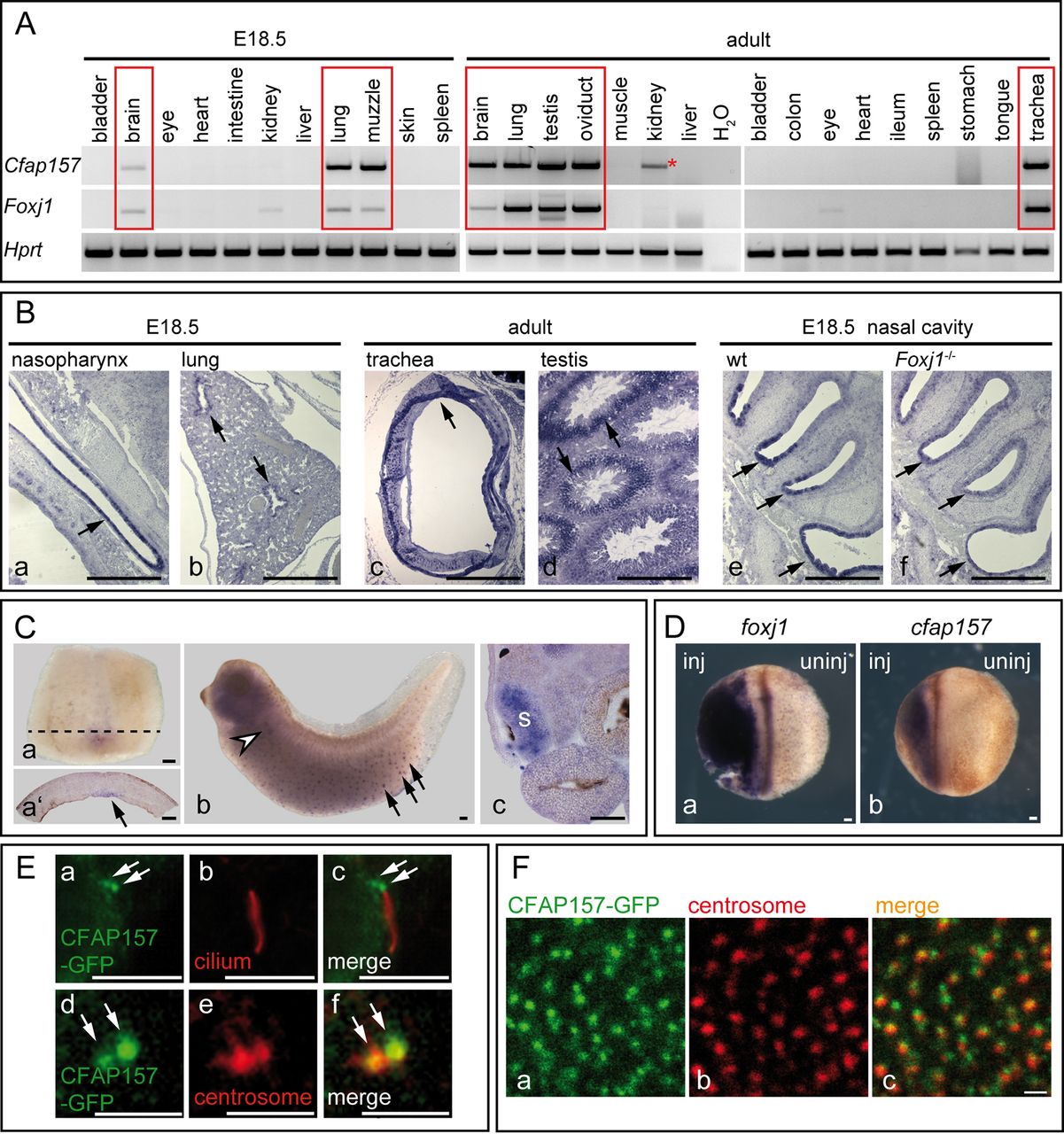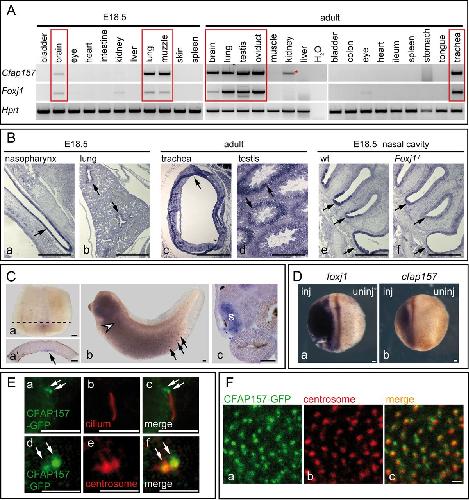 Fig. 1. Expression and localisation of Cfap157 RNA and protein. (A) RT-PCR with primers in exons 1 and 3 of Cfap157, in exons 2 and 3 of Foxj1, and in exons