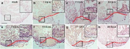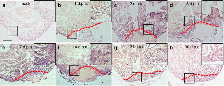 Figure 1. brg1 is upregulated during cardiac regeneration in zebrafish.In situ hybridization was performed on paraffin sections of mock-operated zebrafish (a) and those with amputated ventricular apexes (b–h) at the indicated time points using a digoxigenin-labelled anti-sense brg1 RNA probe. Note induced expression of brg1 in the injured heart from 1 to 14 d.p.a. (b–f). Dashed lines mark the resection sites; the right upper corner is high-magnification image of the framed area; similar results were confirmed by performing three independent experiments. Scale bar, 100 μm. |