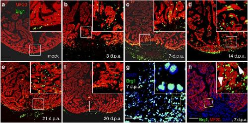 Figure 2. Brg1 is activated in multiple types of cells during cardiac regeneration in zebrafish.(aâf) Immunofluorescence staining of Brg1 and cardiac sarcomere myosin heavy chain (MF20) was performed on paraffin sections of mock-operated zebrafish (a) and those with amputated ventricular apexes (bâf) at the indicated time points. The right upper corners are high-magnification images of the frame area in aâf, showing Brg1 co-localization in MF20-positive myocytes. (g) Co-staining of Brg1 and 4,6-diamidino-2-phenylindole (DAPI) in paraffin sections of amputated apexes at 7âd.p.a. The right upper corner is high-magnification image of the framed area. (h) Immunofluorescence staining of Brg1 and MF20 of amputated heart at 7âd.p.a., showing the co-localization of Brg1 and MF20. The right upper corner is high-magnification image of the framed area. These data were confirmed by performing three independent experiments. Scale bars, 100âμm. |