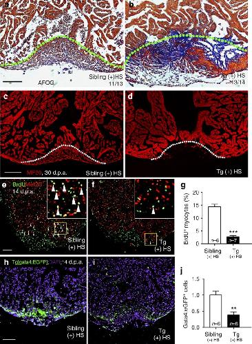 Figure 3. Inhibition of brg1 impairs cardiac regeneration.(a–d) Representative sections from wild-type siblings (a,c) and Tg(hsp70:dn-xbrg1) (b,d) hearts at 30 d.p.a., evaluated by AFOG staining (a,b), and immunofluorescence staining with anti-myosin heavy chain (MF20) (c,d). Note massive fibrosis (b) and compromised myocardial regeneration (d) in Tg(hsp70:dn-xBrg1) hearts (tg). Dashed lines mark the resection site. (e–g) Paraffin sections of 14 d.p.a. regenerating heart of wild-type sibling (e) and Tg(hsp70:dn-xBrg1) (f) hearts co-stained for BrdU (green), Mef2C (red) and 4,6-diamidino-2-phenylindole (DAPI; blue). Higher-magnification images of areas in squares are shown in the upper-right corners, and Mef2C+/BrdU+ double-positive cardiomyocytes are indicated by arrowheads. (g) Percentages of Mef2C+/BrdU+ cardiomyocytes in the injured area (***P<0.001; n=6 for siblings and 7 for transgenic hearts; data are mean percentages±s.e.m., paired Student’s t-test). (h–j) Paraffin sections of 14 d.p.a. wild-type Tg(gata4:EGFP) sibling (h) and Tg(hsp70:dn-xbrg1; gata4:EGFP) (i) hearts stained with anti-EGFP and DAPI. The average of fluorescence intensity was calculated using Imaris software (j) (**P<0.01; n=6; data are mean percentages±s.e.m.; paired Student’s t-test). Scale bars, 100 μm. |