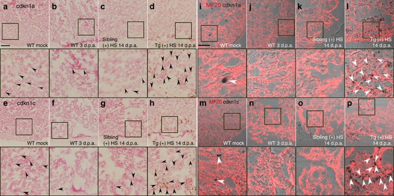 Figure 5. cdkn1a and cdkn1c are induced and enriched in the myocardium of Tg(hsp70:dn-xBrg1) transgenic hearts.(a–h) RNAscope in situ hybridization analysis with cdkn1a (a–d) and cdkn1c (e–h) probes on frozen sections of uninjured wild-type (WT) hearts (a,e), injured WT hearts at 3 d.p.a. (b,f), injured WT sibling hearts at 14 d.p.a. (c,g) and injured Tg(hsp70:dn-xBrg1) transgenic hearts at 14 d.p.a. (d,h). Note the robust induction of cdkn1a (d) and cdkn1c (h) induction in Tg(hsp70:dn-xBrg1) transgenic hearts compared with WT sibling hearts at 14 d.p.a. after heat shock. Black arrowheads indicate the cdkn1a or cdkn1c signals. The panels below a–h are higher-magnification images of areas in squares of a–h. (i–p) Bright-field images of cdkn1a (i–l) and cdkn1c (m–p) expression by RNAscope merged with immunostaining signal images of MF20 on frozen sections of uninjured WT hearts (i,m), injured WT hearts at 3 d.p.a. (j,n), injured WT sibling hearts at 14 d.p.a. (k,o) and injured Tg(hsp70:dn-xbrg1) transgenic hearts at 14 d.p.a. (i,p). Higher-magnification images of squared areas of i–p are shown below their respective panels. Note that both cdkn1a (i) and cdkn1c (m) are normally expressed in cardiomyocytes in uninjured WT hearts, and that they are highly induced in MF20-positive cardiomyocytes of Tg(hsp70:dn-xBrg1) transgenic hearts (l,p) compared with WT sibling hearts (k,o) at 14 d.p.a. White arrowheads show cdkn1a or cdkn1c signals in cardiomyocytes. Tg, Tg(hsp70:dn-xBrg1); (+) HS, heat shock; Scale bars, 100 μm. |
