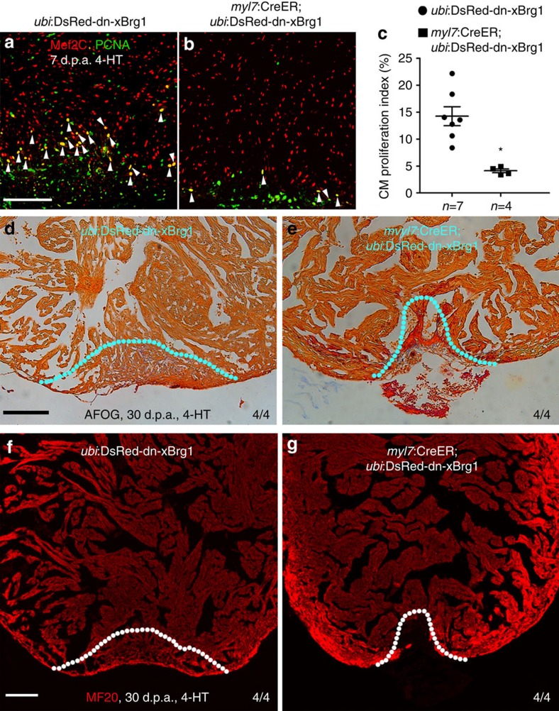 Figure 6. Myocardial-specific inhibition of Brg1 interferes heart regeneration.(a–c) PCNA+/Mef2C+ proliferating cardiomyocytes decreased in Tg(myl7:CreER; ubi:DsRed-dn-xBrg1) transgenic hearts (b) compared with control Tg(ubi:DsRed-dn-xBrg1) transgenic hearts (a) at 7 d.p.a. Statistics of cardiomyocyte proliferation index is shown (*P<0.05; data presented are mean±s.e.m.; paired Student’s t-test) (c). White arrowheads point to PCNA+/Mef2C+ proliferating cardiomyocytes; n, the number of hearts analysed; ubi:DsRed-dn-xBrg1 stands for Tg(ubi:loxP-DsRed-STOP-loxP-dn-xBrg1); tamoxifen (4-HT) was applied at 3 days before injury. (d,e) AFOG staining revealed accumulated fibrin and fibrosis in Tg(myl7:CreER; ubi:DsRed-dn-xBrg1) transgenic hearts (e) compared with control Tg(ubi:DsRed-dn-xBrg1) transgenic hearts (d) at 30 d.p.a. (f,g) MF20 staining showed compromised myocardial regeneration in Tg(myl7:CreER; ubi:DsRed-dn-xBrg1) transgenic hearts (g) compared with control Tg(ubi:DsRed-dn-xBrg1) transgenic hearts (f) at 30 d.p.a. 4/4, all 4 hearts analysed showed the same phenotype. Scale bars, 100 μm. |