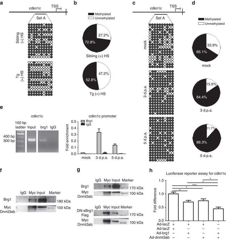 Figure 7. Brg1 represses cdkn1c expression by increasing the level of DNA methylation in its promoter region.(a) Methylation patterns of 10 individual CpG sites in the cdkn1c promoter of Tg(hsp70:dn-xBrg1) and wild-type sibling hearts after daily heat shock from 5 to 14 d.p.a. Upper panel, schematic of 10 CpG island sites (set A) of the cdkn1c promoter region and transcription start site (TSS); lower panels, cdkn1c methylation patterns of wild-type sibling (sibling) and dn-xBrg1 transgenic (tg) hearts, with open circles for ‘unmethylated’ and filled circles for ‘methylated’ CpG islands. Methylated DNA sequences were obtained by bisulfite sequencing. Note decreased methylation of ckkn1c promoter in dn-xBrg1 transgenic hearts (b). (c) cdkn1c promoter methylation of 10 individual CpG sites (set A) of mock, 3 d.p.a. and 5 d.p.a. wild-type hearts. The percentages of unmethylated (white) and methylated (black) DNA from a and b are shown in b and d. (e) Left panel, ChIP assays with anti-Brg1 antibody. Right panel, quantitation of Brg1 immunoprecipitated cdkn1c promoter in wild-type mock, 3 d.p.a. and 5 d.p.a. hearts. Data are presented as Brg1 enrichment relative to control IgG. The 335 bp DNA fragment within the cdkn1c promoter region (−1,625 to −1,290 bp) was amplified from immunoprecipitated DNA of mock, 3 d.p.a. and 5 d.p.a. hearts by anti-Brg1 antibody or control IgG. (f) Immunoprecipitation by anti-Myc antibody in 293T cells over-expressing Brg1 and Myc-tagged Dnmt3ab. (g) Upper panel, immunoprecipitation of Brg1 and Myc-Dnmt3ab by Myc antibody or control IgG antibody in H9C2 cells over-expressing Brg1 and Myc-tagged Dnmt3ab. Lower panel, immunoprecipitation of dn-xBrg1-Flag and Myc-Dnmt3ab by Myc antibody or IgG antibody in H9C2 cells over-expressing dn-xBrg1-Flag and Myc-Dnmt3ab. (h) Luciferase reporter assays showed that over-expression of zebrafish brg1 and dnmt3ab synergistically suppressed the transcription of cdkn1c in 293T cells. 293T cells were transfected/infected with the indicated adenoviral constructs and luciferase reporter constructs, and those cells were then collected and measured for luciferase activity at 24 h after transfection/infection. Equal amounts of adenovirus were used for each group. Firefly luciferase activity was normalized by Renilla luciferase activity (*P<0.05, ***P<0.001; data are mean±s.e.m.; one-way analysis of variance followed by Bonferroni’s multiple comparison test). |