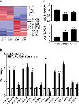 Figure 4. Transgenic inhibition of Brg1 induces expression of cyclin-dependent kinase inhibitors.(a) Heat map of Z-score values showing genes differentially expressed between Tg(hsp70:dn-xBrg1) (tg1 and tg2) and wild-type sibling (sib1 and sib2) hearts. The FPKM (fragments per kilobase of exon per million fragments mapped) value of each gene was normalized using Z-scores. Genes were ranked by the mean Z-scores in the highest-expression group. (b) Tg(hsp70:dn-xBrg1) and wild-type sibling zebrafish were heat-shocked daily from 5 to 14 d.p.a., and total RNA was isolated from their hearts at 14 d.p.a. Quantitative PCR showed that the cdkn and meis genes, as well as fibrotic markers (col1a1a, col1a2, tgfb1a, tgfb2, tgfb3 and vimentin) were upregulated in transgenic hearts (*P<0.05, ***P<0.001; data are mean fold changes after normalized to GAPDH and expressed as mean±s.e.m.; paired Student’s t-test). (c) Quantitative PCR showed higher expression of brg1 but lower expression of cdkn1c in wild-type hearts at 3 and 5 d.p.a. than mock hearts, suggesting a repressive role of brg1 in regulating cdkn1c. GAPDH was used to normalize the RNA level (**P<0.01, ***P<0.001; data are mean±s.e.m.; one-way analysis of variance followed by Dunnett’s multiple comparison test, mock served as control). |