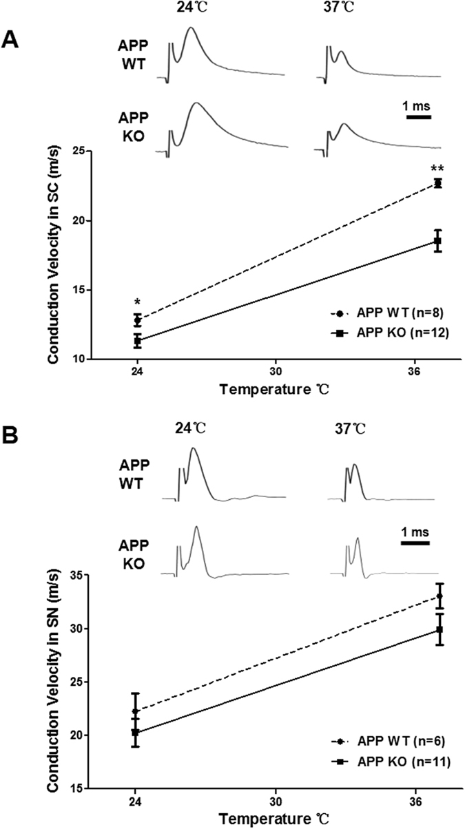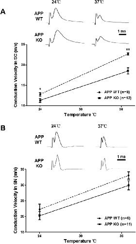 Figure 1. Conduction velocities of compound action potentials (CAPs) are reduced in the spinal cords of APP KO mice.Representative CAPs from the spinal cords (SC, A) and the sciatic nerve (SN, B) of APP KO and WT mice. Representative CAPs recorded at 24â°C and 37â°C from spinal cords of APP KO and WT mice (upper panel). The conduction velocity measured in WT mouse spinal cord (open bars) was consistently higher than that seen in APP KO mice (closed bars) at both temperatures measured (lower panel). N numbers are indicated inside the bars. Studentâs t-test, *pâ<â0.05; **pâ<â0.01. Error bars represent meanâ±âS.E.