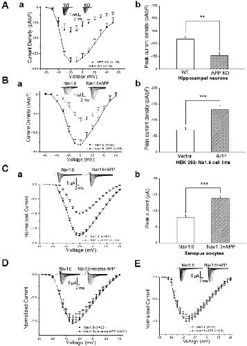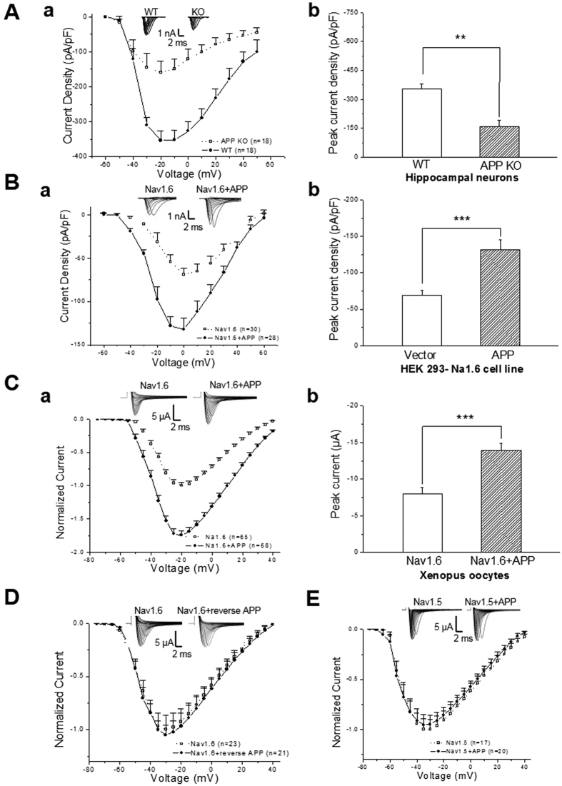 Figure 2. APP enhances of sodium current expression through modulation of α-subunit of Nav1.6.(A) Sodium current expression is reduced in hippocampal neurons from APP KO mouse. Whole cell recordings of voltage-gated sodium currents from hippocampal slice of APP KO and WT mice at 7–8 weeks old of age. Sodium current responses elicited by depolarizing voltage steps (from −60 mV to 60 mV, 10 mV increments) in a neuron from WT and APP KO mice. (a), Current-voltage relationships of sodium currents density in WT mice (open squares) and APP KO mice (solid circles). pF, picofarads. (b) Peak currents density in APP KO and their littermate WT mice. (B) Overexpression of APP enhances sodium currents in HEK293 cells stably expressing α-subunit of human Nav1.6 (HEK293-Nav1.6 cells). Whole cell recordings of voltage-gated sodium currents in APP- and empty vector (vector)-transfected HEK293-Nav1.6 cells. Sodium current responses elicited by depolarizing voltage steps (from −60 mV to 60 mV, 10 mV increments). (a), Current-voltage relationships of sodium currents density in vector-(open squares) and APP-transfected HEK293-Nav1.6 cells (closed circles). pF, picofarads. (b), Peak currents density in vector- and APP-transfected HEK293-Nav1.6 cells. (C) APP enhances sodium currents in Xenopus oocytes. Two-electrode voltage-clamp recordings in oocytes which were injected cRNA for Nav1.6 α subunits and together with APP. The oocytes injected cRNA for Nav1.6 α subunits alone were recorded as the control. Sodium current responses elicited by depolarizing voltage steps (−75 mV to 40 mV, 5 mV increments). (a), Normalized current-voltage relationships of currents in oocytes expressing Nav1.6 α subunits alone (open squares) and together with APP (closed circles). (b), Sodium peak currents in oocytes expressing Nav1.6 α subunits alone and together with APP. (D) Normalized current-voltage relationships of sodium currents by two-electrode voltage-clamp recordings in oocytes injected cRNA for Nav1.6 α subunit alone (open squares) and those injected cRNA for Nav1.6 α subunitvand the reversed sequence of APP (closed circles). (E) Normalized current-voltage relationships of sodium currents by two-electrode voltage-clamp recordings in oocytes expressing Nav1.5 α subunit alone (open squares) and those expressing Nav1.5 α subunit together with APP (closed circles). Insert: Representative examples of sodium current responses elicited by depolarizing voltage steps. One-way ANOVA, *p < 0.05; **p < 0.01; ***p < 0.001. Error bars represent mean ± S.E.