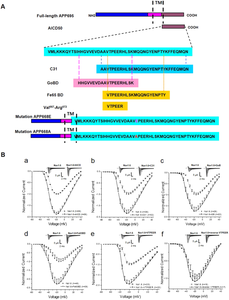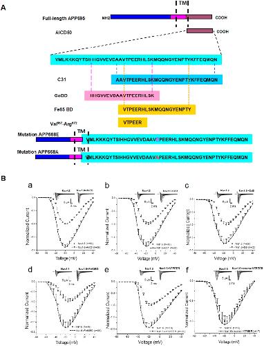 Figure 3. The effects of distinct APP intracellular domains on voltage-gated sodium channels.(A) Schematic representation of APP (full-length APP695), APP intracellular domain (AICD50), APP C31 domain (C31), APP Go protein binding domain (GoBD), Fe65 binding domain (Fe65BD) and VTPEER peptides (Val667-Arg672). (B) Normalized current-voltage relationships of currents in oocytes expressing Nav1.6 α subunit and together with APP intracellular domain (AICD50; (a); closed circles), APP C31 domain (C31; (b); closed circles), APP Go protein binding domain (GoBD; (c); closed circles), Fe65 binding domain (Fe65BD; (d); closed circles), VTPEER peptide (VTPEER; (e); closed circles) and the reversed VTPEER sequence (reverse VTPEER; (f); closed circles). The oocytes expressing Nav1.6 α subunit alone were recorded as control (a–f; open squares). Insert: Representative examples of sodium current responses elicited by depolarizing voltage steps.