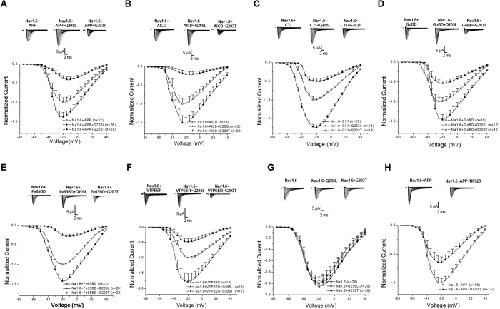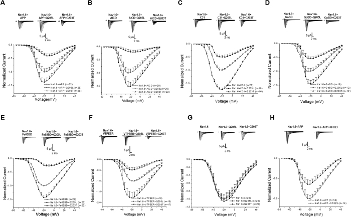 Figure 4. APP Increases Nav1.6 currents in a Go Protein-dependent manner.(A–F), Normalized current-voltage relationships of currents in oocytes expressing Nav1.6 α subunits and distinct APP intracellular domains alone (open squares; (A) Full-length APP; (B) AICD; (C) C31; (D) Go protein binding domain, GoBD; (E) Fe65 binding domain, FeBD; (F) VTPEER peptides together with a dominant active mutant of Go protein α subunit (Q205L, closed circles) or a dominant negative mutant of the Go protein α subunit (G203T; closed triangles). (G) Normalized current-voltage relationships of currents in oocytes expressing Nav1.6 α subunits alone (open squares) and together with a dominant active mutant of Go protein α subunit (Q205L, closed circles) or a dominant negative mutant of the Go protein α subunit (G203T; closed triangles). (H) Normalized current-voltage relationships of currents in oocytes expressing Nav1.6 α subunits and APP with (closed circles) or without (open squares) intracellular injection G protein inhibitor NF023. Insert: Representative examples of sodium current responses elicited by depolarizing voltage steps. Error bars represent mean ± S.E.