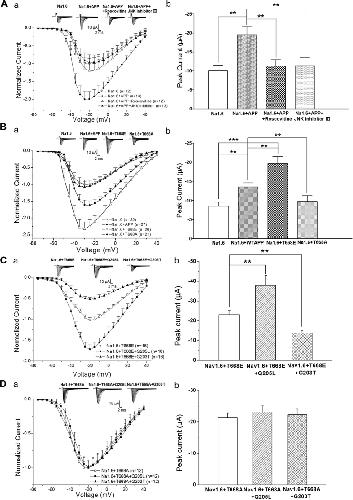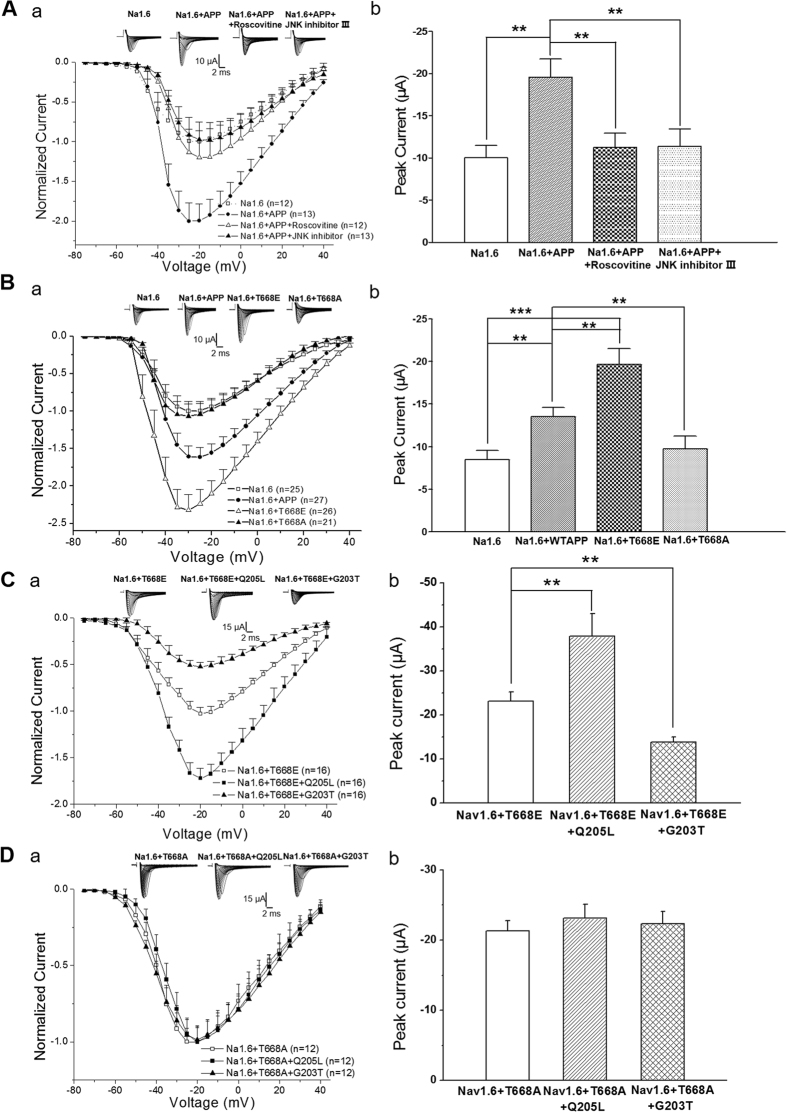 Figure 5. Thr-668 phosphorylation of APP enhances sodium current expression.(A) Normalized current-voltage relationships of currents in oocytes expressing Nav1.6 α subunits alone (a; open squares) and together with APP (a; closed circles), APP plus CDK5 inhibitor (a; Roscovitine 10 μM; open triangles) and APP plus JNK inhibitor (a; JNK inhibitor III 7 μg/ml, closed triangles). The mean peak sodium current amplitude in oocytes injected with Nav1.6 and APP and applied with the indicated inhibitors (b). (B) Normalized current-voltage relationships of currents in oocytes expressing Nav1.6 α subunits alone (a; open squares) and together with wild-type APP (a; closed circles), APP T668E (a; open triangles), and APP T668A (a; closed triangles). The mean peak sodium current amplitude in oocytes injected with Nav1.6 and the indicated APP or APP mutant cRNAs (b). (C) Normalized current-voltage relationships of currents in oocytes expressing Nav1.6 α subunits with APP T668E alone (open squares) and together with a dominant active mutant of Go protein α subunit (Q205L, closed squares) or a dominant negative mutant of the Go protein α subunit (G203T; closed triangles) (a). The mean peak sodium current amplitude in oocytes injected with Nav1.6 and T668E and the Go mutant cRNAs (b). (D) Normalized current-voltage relationships of currents in oocytes expressing Nav1.6 α subunits with APP T668A alone (open squares) and together with a dominant active mutant of Go protein α subunit (Q205L, closed squares) or a dominant negative mutant of the Go protein α subunit (G203T; closed triangles) (a). The mean peak sodium current amplitude in oocytes injected with Nav1.6 and T668A and the Go mutant cRNAs (b). Insert: Representative examples of sodium current responses elicited by depolarizing voltage steps. One-way ANOVA. **p < 0.01; Error bars represent mean ± S.E.