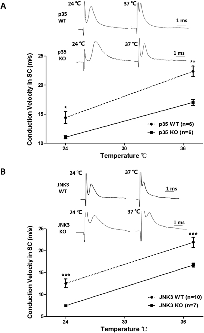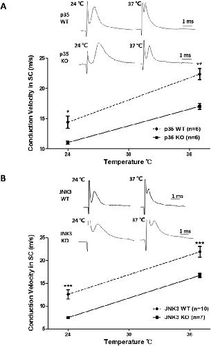 Figure 7. Conduction velocities of compound action potentials in the spinal cords of p35 and JNK3 knockout mice.Determination of conduction velocities of CAPs in p35 (A) and JNK3 (B) KO and WT mice. Representative CAPs from spinal cords of p35 (p35 KO; n = 6) and JNK3 (JNK3 KO; n = 7) KO and their wild-type mice (n = 6 for P35 WT; n = 10 for JNK3 WT). Representative CAPs recorded at 24 °C and 37 °C from spinal cords of APP KO and WT mice (upper panel). The conduction velocity measured in WT mouse spinal cord (open bars) was consistently higher than that seen in APP KO mice (closed bars) at both temperatures measured (lower panel). N numbers are indicated inside the bars. Student’s t-test, *p < 0.05; **p < 0.01. Error bars represent mean ± S.E.