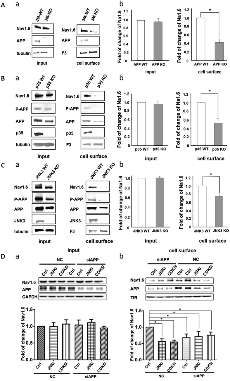 Figure 6. The cell surface expression of Nav1.6 sodium channels in APP, p35 and JNK3 knockout mice and Hek 293-Na1.6 cells for virous treatments.Analysis of cell surface expression of Nav1.6 protein in the white matter of spinal cord isolated from mutant mice and Hek 293-Na1.6 cells. Total proteins and cell surface proteins, biotinylated and pull-down by NeutrAvidin Gel, were subjected to Western blots (n = 3). (A–C) Total proteins and cell surface proteins isolated from the ventral white matter of spinal cords of APP KO (Aa), p35 KO (Ba), JNK3 KO (Ca) and their littermate WT mice were blotted using antibodies against Nav1.6, APP, phosphorylated APP at T668 (p-APP), F3, p35, JNK3 and γ-tubulin. Quantification of the level of protein expression in input and cell surface. The levels of Nav1.6 in the WT spinal cords were normalized to 1.0, the relative levels of Nav1.6 in KO mice were quantified (b). (D) HEK293-Nav1.6 cells were transfected APP siRNA or a scrambled siRNA (NC) and then treated with JNK inhibitor III (JNKi, 10 μg/ml), CDK5 inhibitor (CDK5i, 20 μM Roscovitine) or vehicle/DMSO (Control, Ctrl). Western blot analysis of the cell surface expression or the total protein of Nav1.6 using antibodies against Nav1.6 and APP. GAPDH and (transferrin receptor, TfR) were loaded as control. The levels of Nav1.6 in DMSO-treated NC-transfected cells were normalilzed to 1.0. The relative levels of Nav1.6 in other groups of the cells as indicated were quantified. Student t test. *, p < 0.05; **, p < 0.01. Error bars represent mean ± S.E.