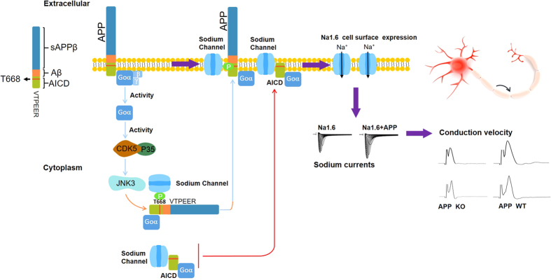 Figure 8. Schematic model for regulation of Nav1.6 by APP.APP through VTPEER activates Go protein, which enhances phosphorylation of APP (Thr668) by activating of JNK3. Phosphorylated APP (Thr668) binds to Nav1.6 and promotes cell surface expression of Nav1.6. In addition, activation of Goα further enhances the functional interaction between phosphorylated APP (Thr668) and Nav1.6. AICD, after cleavage from full-length APP, upon being phosphylated (Thr668), increases cell surface expression of Nav1.6 as well, which is also mediated by activity of Goα. Phosphorylated APP/AICD (Thr668) mediates cell surface expression of Nav1.6 may through promoting Nav1.6 insert into the cell surface or maintaining Nav1.6 on the cell surface.