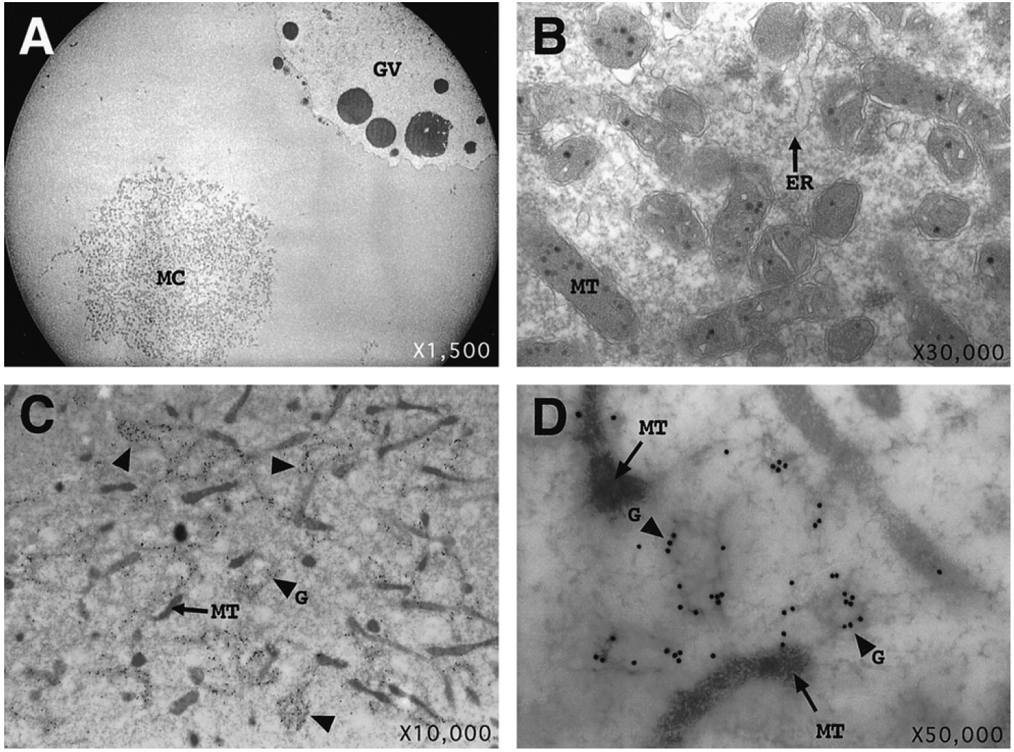 Arrows indicate mitochondria (MT), and arrowheads indicate gold particles (G). The magnification is indicated in the lower right of each