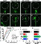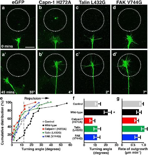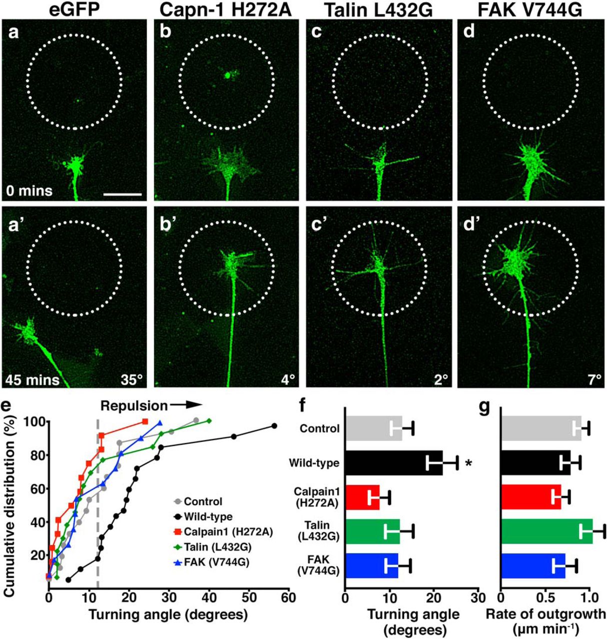 Stimulation of filopodial Ca2+ transients causes repulsive turning through calpain-mediated cleavage of talin and FAK. a, aâ², Two time-point images of a GFP-expressing growth cone loaded with NP-EGTA undergoing repulsive turning from an area exposed to pulsed UV light (dashed circle) at 10 s intervals. bâd, Two time-point images of growth cones loaded with NP-EGTA and expressing GFP-capn1-H272A (b), GFP-talin-L432G (c), or GFP-FAK-V744G (d) show no repulsive turning to pulsed UV light after 45 min of outgrowth. e, Cumulative distribution of all axon turning angles for control (no NP-EGTA, gray), NP-EGTA loaded wild-type-, capn1-H272A-, talin-L432G-, or FAK-V744G-expressing growth cones. The vertical dashed line represents the mean turning angle for the control growth cones. f, g, The mean turning angle (f) and the mean rate of outgrowth (g) for each condition. Scale bar, 5 μm. n > 10 growth cones for each condition. *p < 0.05, KruskalâWallis with Dunn's multiple-comparison test.
