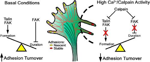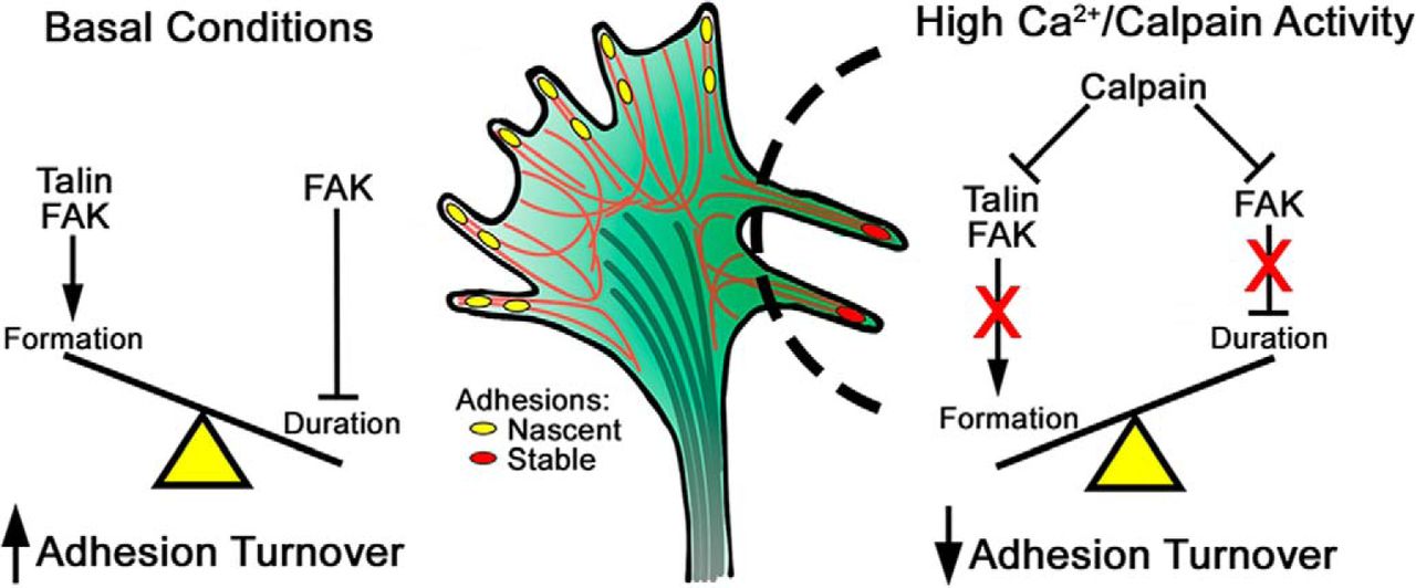 Ca2+/calpain regulation of adhesion dynamics and growth cone motility. Growth cones exhibit repulsive turning from local Ca2+ elevations in filopodia. Under basal conditions in our experiments, talin and FAK promote integrin-based adhesion formation, while FAK promotes the disassembly of adhesions to maintain consistent adhesion turnover. Local Ca2+ elevations (dashed lines) in response to repulsive axon guidance cues (presumed) or uncaging of Ca2+ in filopodia (this study) activates calpain. Filopodial calpain activity cleaves talin and FAK to prevent adhesion formation and turnover, and tips the balance between formation and duration that results in Ca2+-dependent repulsive turning.