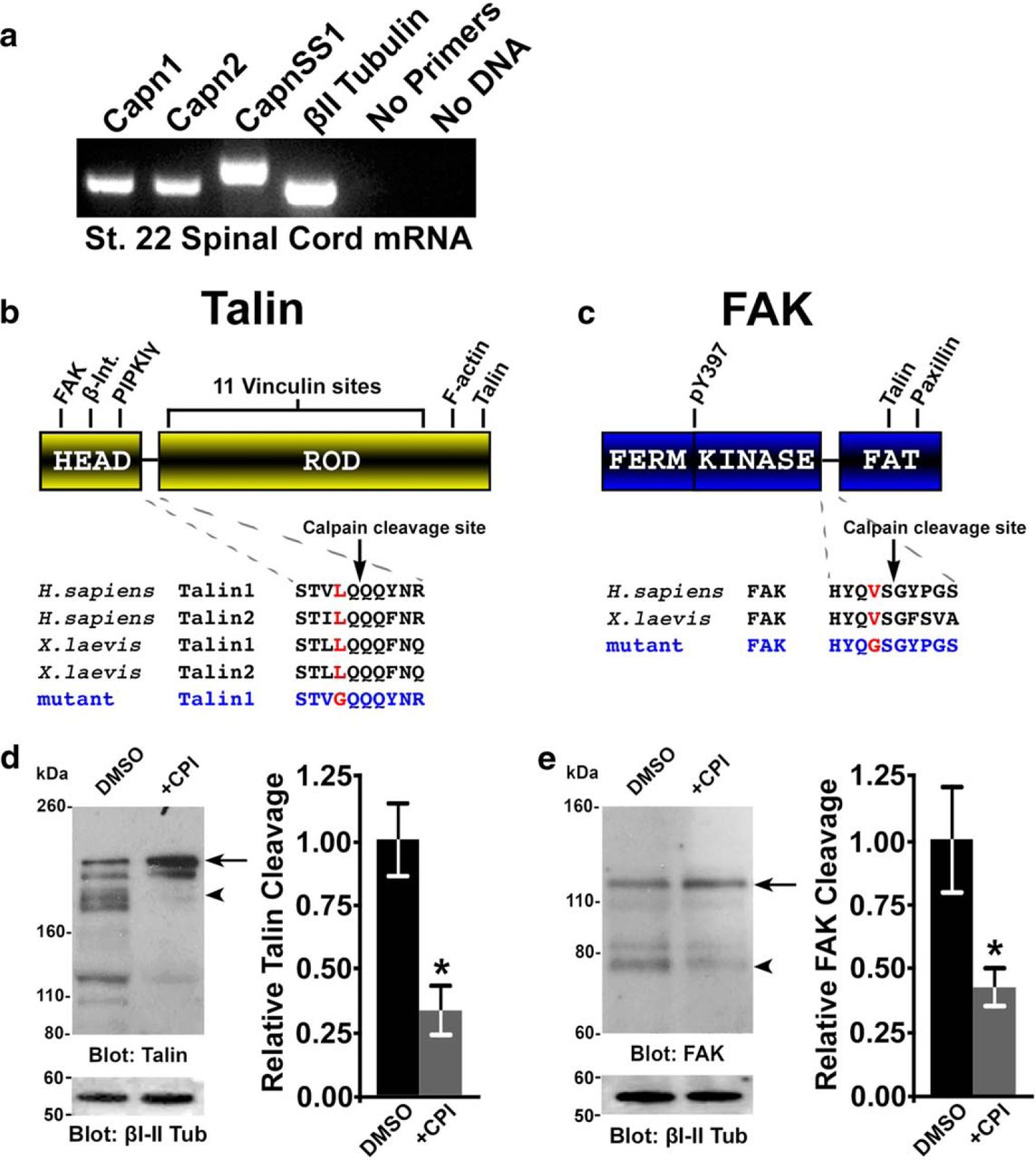 Talin and FAK are cleaved by calpain within the embryonic spinal cord. a, RT-PCR amplification of mRNA transcripts of calpain1 (262 bp), calpain2 (262 bp), calpainSS1 (299 bp), and βII tubulin (251 bp) from stage 22 Xenopus spinal cords. b, c, Schematic domain organization of talin (b) and FAK (c) showing approximate location of protein interaction motifs and calpain cleavage sites. Below are human and Xenopus protein sequences of the calpain cleavage sites, which are highly conserved between species. d, Immunoblots for talin from Xenopus neural tube lysates incubated in control media or media containing a calpain protease inhibitor (1 μm CPI) for 30 min. The full-length talin band is at 230 kDa (arrow), and the cleaved talin is at 190 kDa (arrowhead). An additional calpain-dependent fragment (Vinculin-Actin-Dimerization domain fragment) was found at 120 kDa (not quantified). Note that all bands appear as doublets since the antibody recognizes both talin isoforms. The average talin cleavage in control and CPI (right) was quantified from the large isoform band intensities (190 kDa band/230 kDa) from multiple blots (n = 7). e, Immunoblots for FAK from Xenopus neural tube lysates incubated in control media or media containing a calpain protease inhibitor (1 μm CPI) for 30 min. The full-length FAK band is at 116 kDa (arrow), and cleaved FAK is at 80 kDa (arrowhead). The average FAK cleavage in control and CPI (right) was quantified (80 kDa band/116 kDa) from multiple blots (n = 6). *p < 0.05, MannâWhitney U test.
