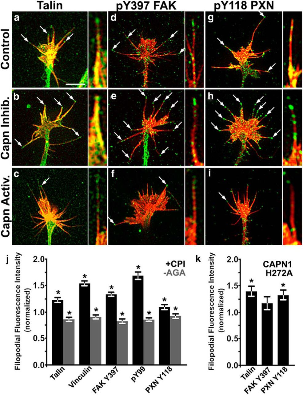 Calpain activity regulates adhesion protein localization and signaling in filopodia. aâi, Immunocytochemistry experiments were performed with cultured Xenopus spinal neurons plated on laminin. The fluorescence intensity within filopodia was quantified in the following three conditions: control, with 1 μm CPI (calpain inhibition), or without AGAs (âAGAs, calpain activation). aâi, Representative images of growth cones (left) and filopodia (right) shown for selected adhesion proteins, as follows: talin (aâc), phospho-tyrosine 397 FAK (FAK Y397; bâh), and phospho-tyrosine 118 paxillin (PXN Y118; câi). Immunolabeled adhesion proteins are in green, and phallodin-labeled F-actin is in red. Arrows indicate localization to filopodial tips. j, Quantification of filopodial fluorescence intensity of all adhesion markers tested, including vinculin and total phospho-tyrosine (pY99), with inhibition of calpain or Ca2+-dependent activation of calpain by removal of AGAs. k, Quantification of filopodial fluorescence intensity of talin, FAK Y397, and PXN Y118 in growth cones expressing GFP-tagged dominant-negative calpain1 (H272A) normalized to cocultured wild-type neurons. Scale bar, 5 μm. n > 60 growth cones and n > 3 cultures for all conditions. *p < 0.05, MannâWhitney U test.