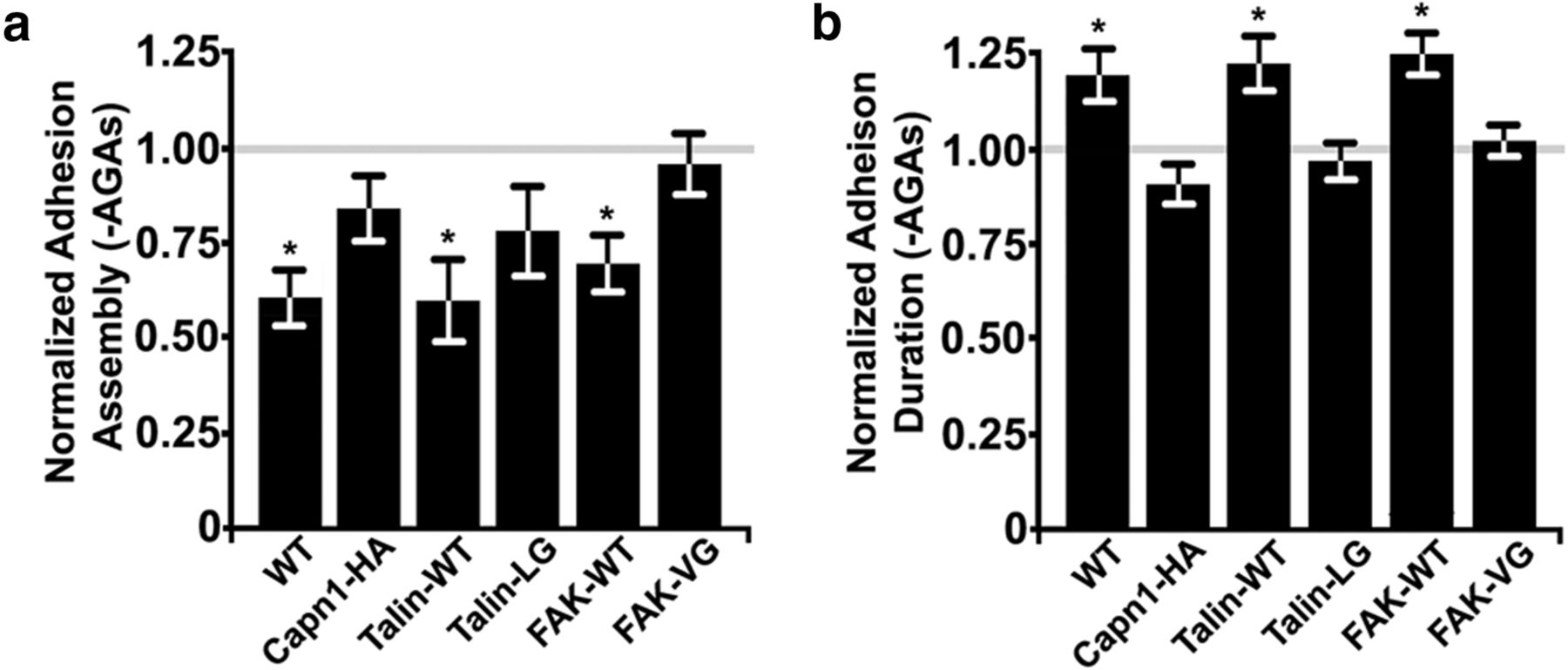 The effects of filopodial Ca2+ transients on adhesion dynamics are blocked by inhibition of calpain activity and cleavage of talin and FAK. a, b, Change in growth cone adhesion assembly rate (a) and adhesion duration (b) after disinhibition of filopodial Ca2+ transients by removing AGAs in wild-type-, capn1-H272A-, talin-WT-, talin-L432G-, FAK-WT-, and FAK-V744G-expressing growth cones in vitro. Paired measurements were made from the same growth cones before and after the removal of AGAs, and data were normalized to the rate of adhesion assembly and duration in normal culture conditions. Statistical comparisons were made within the same growth cones before and after the removal of AGAs within each group. For each group, n > 110 individual adhesions and n > 10 growth cones. *p < 0.05, Mann–Whitney U test or Student's t test.