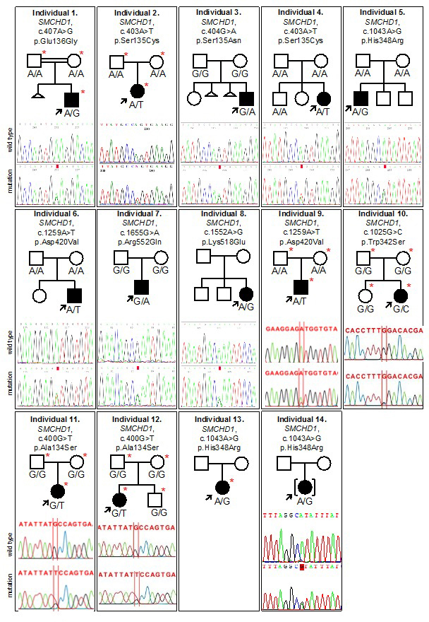 De novo mutations in SMCHD1 cause Bosma arhinia microphthalmia syndrome and abrogate nasal development.