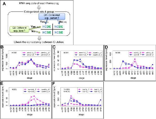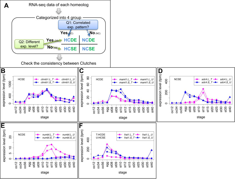 Criteria and examples of transcriptome correlation analysis. (A) Criteria for categorization of homeologous gene expression. See Materials and Methods for details. All results are presented in Suppl. Data3. (B-E) Examples of four groups. Group names are presented in each graph. In case of inconsistencies, group names in different clutches are presented separately. (B) ctnnb1.L (β-catenin.L) and ctnnb1.S (β-catenin.S) showed quite similar expression patterns (HCSE). (C) maml1.L showed highly correlated, but stronger expression than maml1.S throughout developmental stages (st8-12) (HCDE). (D) sdc4.L and sdc4.S showed different expression patterns during development (NCSE). (E) numbl. L showed stronger expression than numbl.S and the two expression patterns are quite different throughout developmental stages. (F) An example of inconsistent categories between clutches. frat1.S was expressed at higher levels than frat1.L during development in Clutch T (HCDE), but both showed similar expression levels in Clutch U (HCSE). Line graphs show expression levels of genes during oogenesis and embryogenesis. Magenta, L genes; Blue, S genes; circles, Clutch T; triangles, Clutch U.