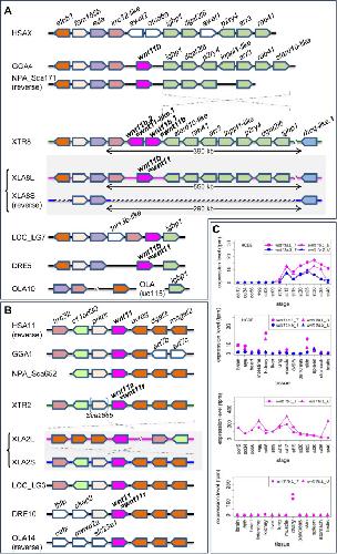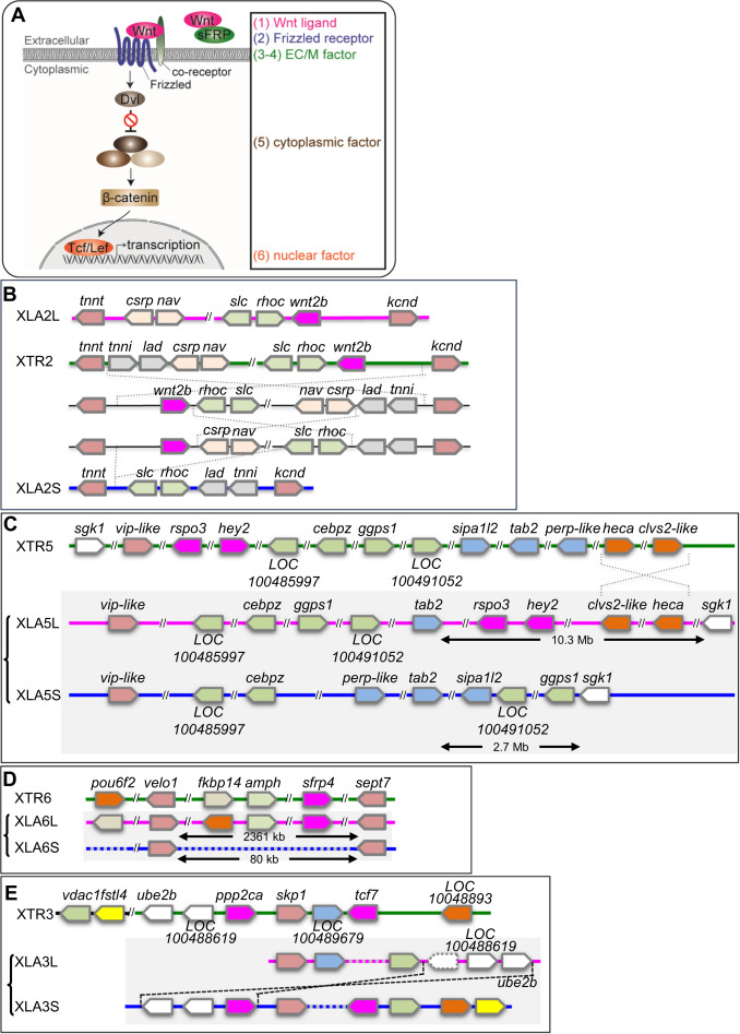 Syntenic analyses of Wnt signaling-related singletons inX. laevisandX. tropicalis. (A) Schematic view of the Wnt signaling pathway. Categories based on subcellular localization are indicated at the right. (B) Synteny around wnt2b. XLA2L retains conserved synteny around wnt2b with X. tropicalis chromosome 2 (XTR2), but several rearrangements may have occurred in XLA2S. (C) Synteny around rspo3. Complicated rearrangements were observed on both L and S chromosomes. (D) Comparison of sfrp4 loci. sfrp4.S was lost in a large deletion (~23 Mb) between velo1 and sept7 on XLA6S. (E) Comparison of genomic loci surrounding ppp2ca and tcf7. XLA3S retains conserved synteny with XTR3, even though LOC100489679 was deleted. On the other hand, XLA3L lost tcf7 and there was a large inversion close to vdac1.L. In addition, a pseudogene of ppp2ca.L, shown with a dashed box, was found between vdac1.L and LOC100488619.L. Magenta boxes show singletons involved in Wnt signaling, except hey2 in (C), which is related to Notch signaling. Double diagonal lines indicate a large gap between genes. Diagonal lines on the genome signify deletion of genes. Dashed lines represent putative inversion events. In each panel, only representative gene models are shown for comparison.