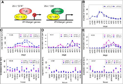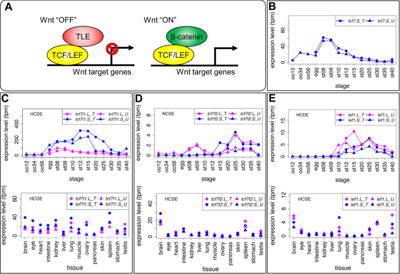 Variable expression patterns of Tcf/Lef genes. (A) Schematic drawing of transcriptional regulation for Wnt target genes by Tcf/Lef. The Tcf family has a β-catenin-binding domain and a TLE/Groucho-binding domain in addition to the HMG box DNA-binding domain. When canonical Wnt signaling is off, Tcf protein represses target genes by forming a complex with TLE transcriptional corepressors. When canonical Wnt signaling is activated, β-catenin accumulates in the nucleus, Tcf forms a complex with β-catenin, and recruits other coactivators for transcription of target genes. (B-E) Expression profiles of tcf/lef genes. Data are shown in graphs similar to those in Fig. 1. See text for detailed explanations of variable expression profiles.