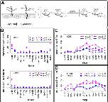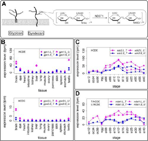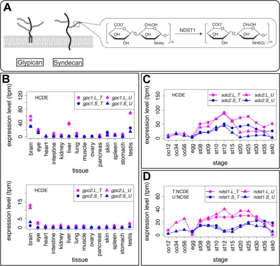 Genes involved in heparan sulfate proteoglycans also showed variable expression profiles. (A) Schematic diagram of Glypican (Gpc) and Syndecan (Sdc). Solid lines and branches show core protein and glycosaminoglycan chains, respectively. N-deacetylase/N-sulfotransferase (NDST) removes N-acetyl groups from GlcNAc of nascent sugar chains (N-acetyl heparosan) and substitutes the free amino group with sulfate (N-sulfo HS). (B-D) Expression profiles of gpc1, gpc2, sdc4, and ndst1. Transcriptomic data are shown in graphs similar to those in Fig. 1. See text for detailed explanations of variable expression.