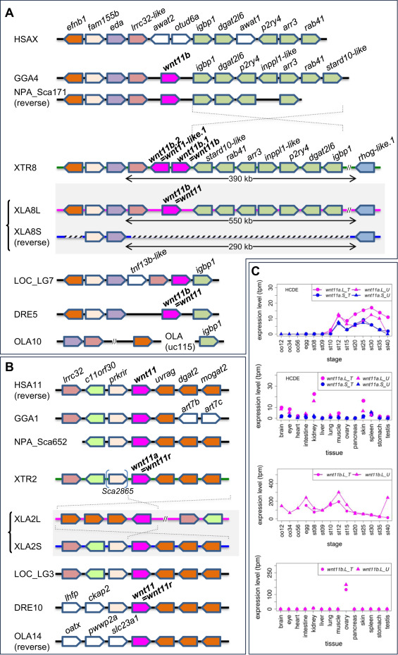 Frequent loss ofwnt11bgenes in vertebrate lineages and variable expression patterns ofwnt11ahomeologs. (A) Synteny around the wnt11b gene in vertebrates. wnt11b.S was deleted from X. laevis chromosome 8S (XLA8S) together with neighboring genes. Orthologs of wnt11b were also deleted in humans (HSAX) and medaka (OLA10). After the divergence of Xenopus and Nanorana, a large inversion seems to have occurred between igbp1 and stard10-like, as indicated by dashed lines. (B) Synteny around the wnt11a gene in vertebrates. Although a genomic rearrangement was found in XLA2L, wnt11a orthologs and synteny are highly conserved among vertebrates. HSA, Homo sapiens; GGA, Gallus gallus (chicken); NPA, Nanorana parkeri (Tibetan frog), XTR, Xenopus tropicalis; XLA, Xenopus laevis; LOC, Lepisosteus oculatus (spotted gar); DRE, Danio rerio (zebrafish); OLA, Oryzias latipes (medaka). (C) Expression profiles of wnt11a.L, wnt11a.S and wnt11b.L. Data are shown in graphs similar to those in Fig. 1. See text for detailed explanations of variable expression profiles.