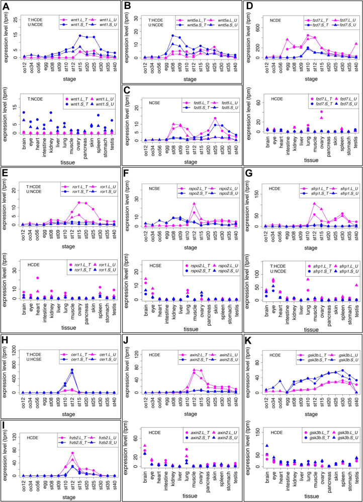 Variable expression profiles of Wnt signaling-components (Wnt ligands, Frizzled receptors, other extracellular/membrane factors, and cytoplasmic factors). (A-K) Variable expression profiles of Wnt signaling components. Data are shown in graphs similar to those in Fig. 1. See text for detailed explanations of variable expression profiles.