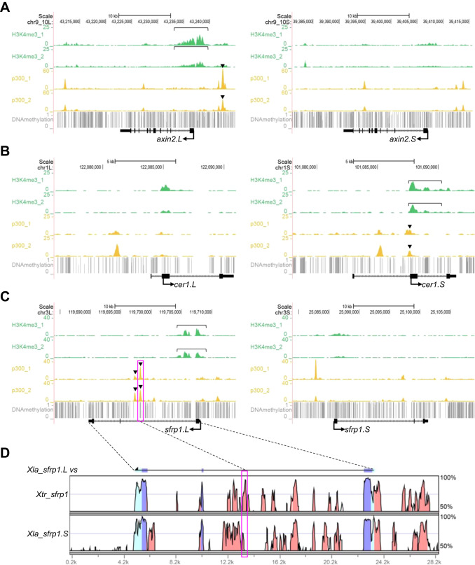 Correlations of epigenetic states and variable expression profiles. (A-C) Genome browser representations of ChIP-seq and DNA methylation data using X. laevis gastrula embryos (st10.5) demonstrated biased enrichment of H3K4me3 and p300 between homeologous genomic regions near axin2, cer1, and sfrp1. ChIP-seq results from biological replicates are shown separately. Green, H3K4me3; yellow, p300; gray, DNA methylation; bracket, strong enrichment of H3K4me3 on the promoter of the more strongly expressed homeolog; arrowhead, strong enrichment of p300 on enhancers of the more strongly expressed homeolog. (D) A vista plot represents sequence conservation in the genomic region around sfrp1 in X. laevis and X. tropicalis. The sequence of sfrp1.L was used as a reference. Light blue, UTR; dark blue, coding sequences; orange, conserved non-coding sequences. Dashed lines and magenta boxes in (C) and (D) correspond to each other.