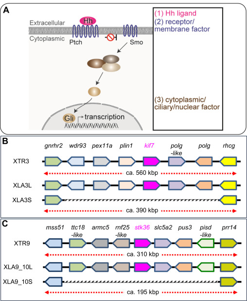Schematic view of Hh signaling and syntenic analyses of its singletons. (A) Overview of the Hedgehog (Hh) signaling pathway. Categories based on subcellular localization are indicated at the right. (B-C) A schematic comparison of syntenies around kif7 (B) and stk36 (C) in X. tropicalis and X. laevis. Only representative gene models are listed for comparison. Regions where corresponding gene models are missing on S chromosomes are outlined in gray.