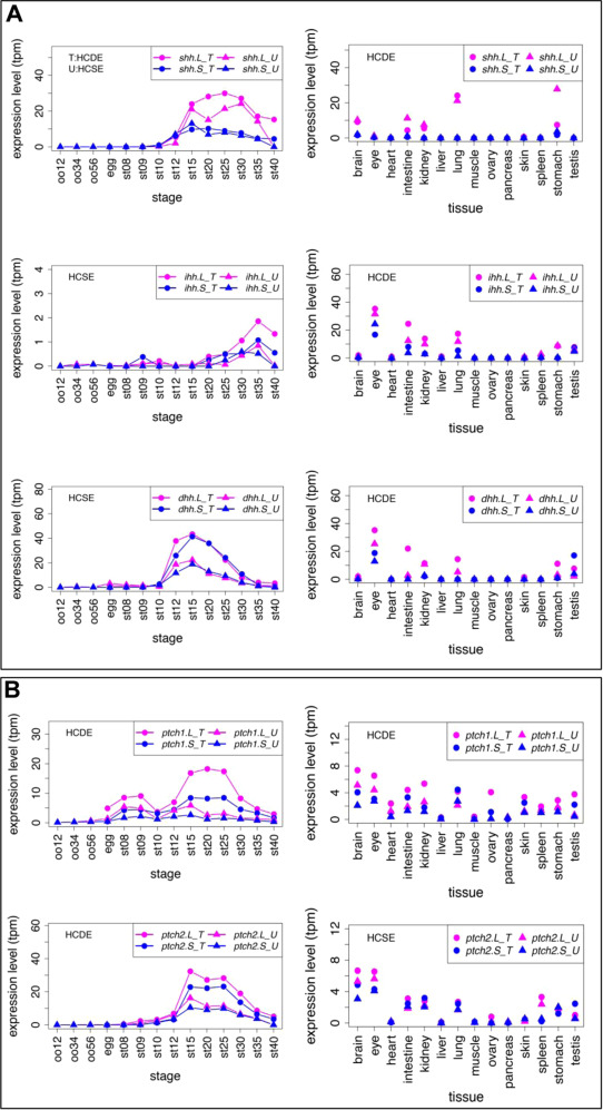 Variable expression profiles of Hh ligands and Ptch receptors. (A) Expression profiles of Hh ligands. (B) Expression profiles of Ptch receptors. Transcriptomic data are shown in graphs similar to those in Fig. 1. See text for detailed explanations of differential expression.
