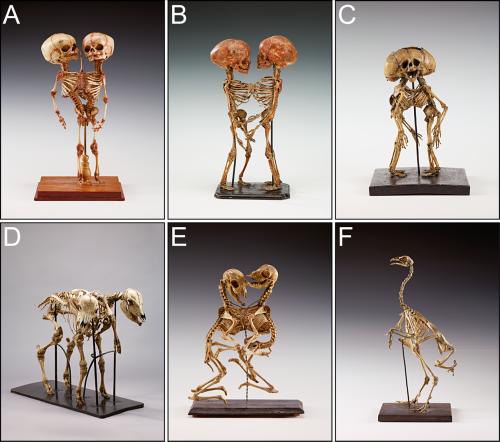 Figure 1. Examples of conjoined human and animal twins from the collection of Johann Friedrich Meckel the older. (A–C) Human dicephalic (A), thoracopagus (B) and cephalothoracopagus (C) specimens. (D) Dicephalic cattle. (E) Thoracopagus sheep. (F) Meckel's four-legged rooster, that reportedly roamed Meckel's chicken run for 3 years. Reproduced from Schultka (2012) with permission