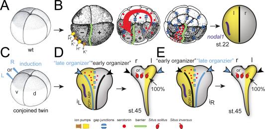 Figure 3. “Ion-flux” model of symmetry breakage in wt embryos and conjoined twins (adapted from various publications from M. Levin; cf., references). (A, B) According to this model, wildtype embryos establish asymmetrical nodal1 expression in the LPM at st. 22 via an asymmetric distribution of serotonin during early cleavage stages. (C–E) In artificially induced conjoined twins (C), late organizers can only instruct a wildtype arrangement of inner organs (st.45) if they give rise to the left twin (iL), that obtained ion-flux prepatterning during cleavage stages (D). Right-sided late organizers (iR) miss prepatterning information and therefore orient the heart randomly (E). Ion-flux prepatterning (yellow), nodal1 LPM expression (purple), induced twin (pink), endogenous twin (black). ABP, apico-basal polarity genes and proteins; PCP, planar cell polarity genes and proteins. B redrawn from Blum et al. (2014b)