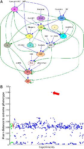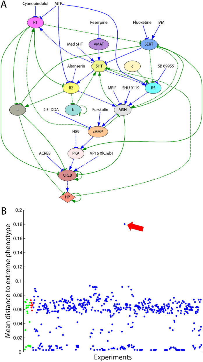 Figure 2. Inferred signaling network model and in silico predictions.(A) A computational method reverse-engineered a signaling network able to recapitulate the level of conversion stochasticity of a series of pharmacological experiments. (B) Phenotypic predictions of the model for all experimental combinations of up to three reagents. Each point represents the mean distance of 100 simulations of a specific experiment (i.e., a specific combination of reagents) to the two extreme tadpole phenotypes (normal and total conversion). Training dataset in green, validation dataset in red, new experiments in blue. Only one combination of three reagents (red arrow) is far from the two extreme phenotypes, indicating a partially converted phenotype.