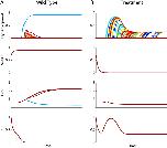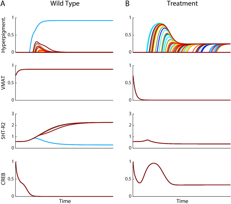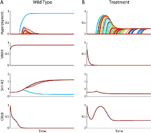 Figure 4. Dynamics of the degree of conversion and perturbed pathway components in the untreated and treated experiments.The panels show the dynamics of the degree of conversion and levels of the affected components by the drugs in the treatment through time over 100 simulations. (A) With no treatment (wild type), only extreme phenotypes (normal or high conversion levels) are stochastically produced. VMAT converges to high levels, R2 to stochastically either high or low levels, and CREB to low levels. (B) The treatment combining reserpine (inhibiting VMAT), altanserin (inhibiting R2), and constitutively active CREB (increasing CREB) produces the expected changes in the levels of the affected pathway components, lowering the levels in the case of inhibitors (VMAT and R2) or increasing them in the case of adding constitutively active CREB. Notice that in both A and B there are trajectories converging at 0 conversion level (normal).