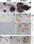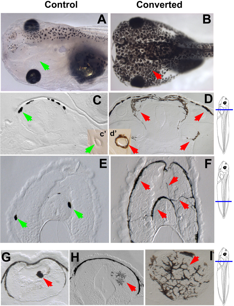 Figure 1. Conversion of melanocytes to a metastatic-like state.(A) Dorsal view of a wild-type st. 45 Xenopus laevis tadpole; note the small melanocytes, absent from large areas of the head (green arrowhead). (B) In contrast, animals resulting from any of several treatments2039 that depolarize instructor (GlyR-expressing) cells or perturb their downstream serotonergic signaling exhibit extensive overabundance and uniform coverage with highly arborized melanocytes (red arrowhead). This occurs in an all-or-none manner in some percentage of the animals (frequency depending on the specific manipulation)2125. Sectioning (level of section shown in schematics to the right) reveals the main features of melanoma-like phenotype: over-proliferation, arborization, and invasiveness. (C) Normally round melanocytes dorsal to the neural tube (green arrow) become highly arborized and drop down over the neural tube itself (D, red arrows). Inset panels show blood vessels, normal in câ and covered by invasive melanocytes in dâ, as occurs in melanoma. Sections further along the tail likewise show small numbers of round melanocytes in control larvae (E, green arrows) compared to the excess of long, abnormally extended and ectopically localized melanocytes in converted animals (F, red arrows). In converted animals, cells can be seen invading the lumen (G) or neural tissue (H) of the neural tube, also often forming networks (I) as has been observed in vasculogenic mimicry of mammalian melanoma40. The authors thank Vaibhav Pai for allowing us to use his drawing of a st. 45 Xenopus laevis tadpole in this figure.