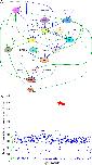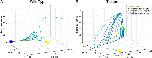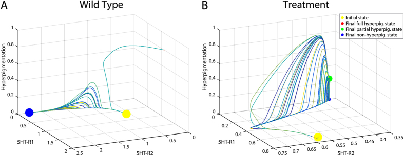 Figure 3. Phase space of the wild type and the experiment predicted to produce a partially pigmented phenotype.The trajectories of the state of two serotonin receptors (5HT-R1 and 5HT-R2) and the degree of conversion is shown among 100 simulations. (A) Without any treatment (wild type), the dynamical system transitions from the initial instable state (embryo, yellow dot) stochastically towards a final stable state with a normal conversion level (0, blue dot) or towards a final state with a high conversion level (0.92, red dot). (B) Applying the treatment combining the discovered three reagents (altanserin, reserpine, and constitutively active CREB), the dynamics reveal a bifurcation in the dynamical system and the appearance of a new attractor with a partial conversion level (0.25, green dot) in addition to another attractor with a normal conversion level (0, blue dot). The attractor dot size is proportional to the number of converging trajectories to that final state.