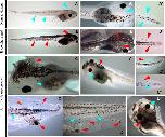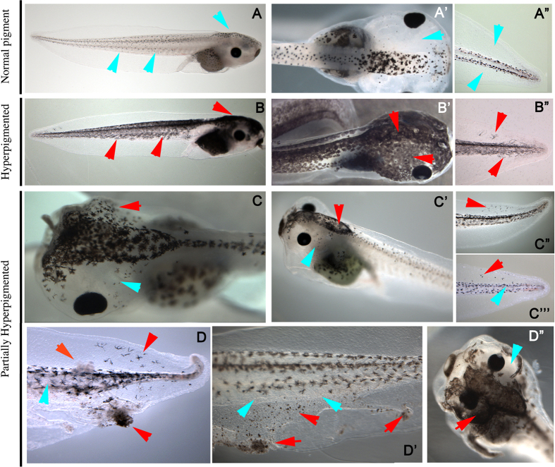 Figure 5. In vivo validation of the computationally discovered partially converted phenotype.Normal melanocytes are indicated with blue arrowheads, while areas populated with converted melanocytes are indicated with red arrowheads. (A) Control animals exhibit small, round melanocytes confined to stripes around the spinal cord and over the brain (A). Note the absence of melanocytes in the periocular region (A’). In normal animals’ tails, melanocytes never exit the stripes of axial muscle (do not venture into the fin). (B) Converted animals produced by Ivermectin-induced depolarization exhibit spread-out (arborized) melanocytes all along the flank (B) and around the eyes (B’)–they colonize every region of the head. The arborized melanocytes also leave the mid-body and colonize the fin (B”). (C) In contrast, embryos treated with VP16-XlCreb1and exposed to 5HT-R2 and VMAT blockers revealed a never before-seen phenotype where some regions of the animal were converted (C, periocular region of the right eye, red arrowhead), and some were wild-type (C, periocular region of left eye, blue arrowhead). This can be also seen in the transformation of cell shape over the brain (C’, red arrowhead) but normal melanocyte morphology elsewhere (C’, blue arrowhead). In the tail (C”,C’”) we observed some cells invading the fin, but they had normal morphology. We observed a great diversity of different combinations that were intermediate between normal and converted outcomes (only a representative sample is shown here), which otherwise never occurred in the same animal. (D) Furthermore, we noticed a new, cancer-like behavior that had not occurred in any previous experiment. This included the induction of individual nodules, which were both pigmented and unpigmented (D,D’); this occurred in ~10% of the animals that likewise exhibited partial conversion (D”, red arrowhead region vs. blue arrowhead region).