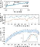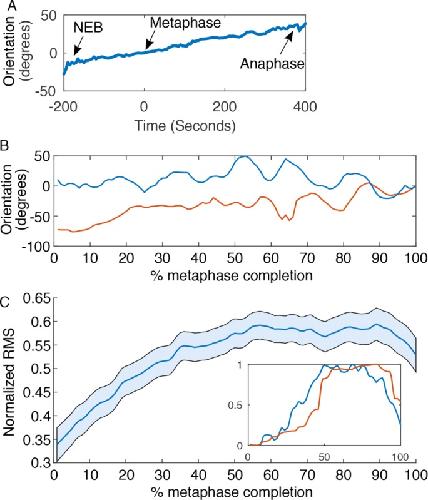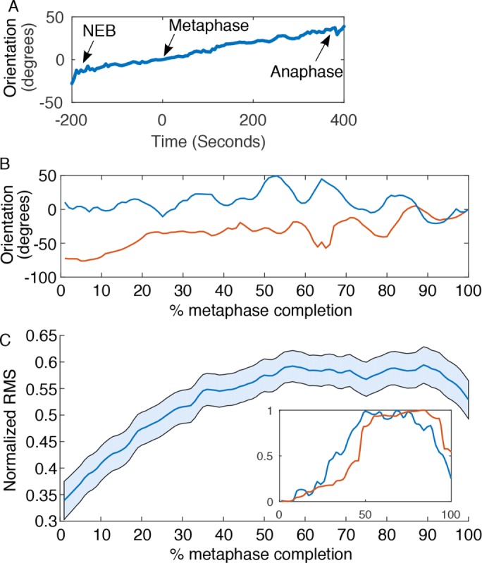 FIGURE 5:. Analysis of oscillations reveals biphasic movement. (A) Average of 100 rotational trajectories reveals net rotation through mitosis, with slight apparent oscillation and decrease in net rotation toward anaphase onset. (B) Rotational traces of two spindles, one that is prealigned with the anaphase axis and one that is not. (C) Average normalized RMS of spindle rotational acceleration over 2-min intervals (24 frames) of 100 spindles during metaphase. This metric will be 0 if the spindle is still or has a constant rotational velocity and increases with greater changes in velocity over the 2-min intervals. RMS is low at early time points and steadily increases to a plateau, indicating that rotational velocity is more constant in early metaphase, consistent with a rotational but nonoscillatory regime, followed by a period of more tumultuous acceleration, indicative of oscillation. Inset, sample RMS traces corresponding to the rotational traces in B.