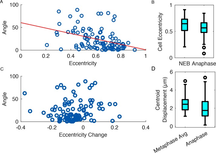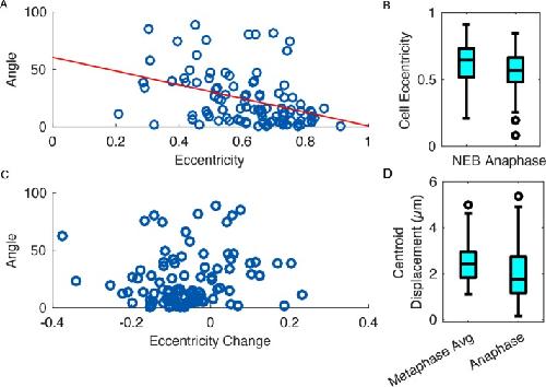 FIGURE 6:. Comparison of cell and anaphase spindle metrics. One hundred cells expressing mChe-H2B, GFP-Tub, and BFP-CAAX were analyzed with the Spindlometer. (A) Comparison of angle between anaphase spindle orientation and NEB cell orientation and cell eccentricity reveals decreased angle as cell eccentricity increases (linear regression fit, slope = â59.6, p < 0.0001). (B) Average cell eccentricity decreased through mitosis (p < 0.0001, paired t test). (C) Angle between spindle and cell orientation is independent of change in cell eccentricity through mitosis (p = 0.24). (D) Comparison of distance between spindle centroid and cell centroid during metaphase and at anaphase onset reveals a significant decrease of displacement (increased spindle centering) at anaphase onset (p = 0.0004, paired t test).