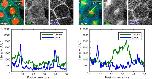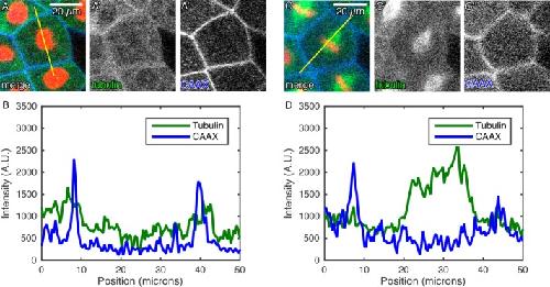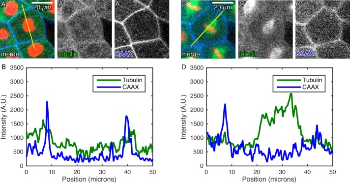 FIGURE 2:. CAAX provides a bright cell-edge marker. (A) Comparison of cortical tubulin and mTagBFP-CAAX (BFP-CAAX, a membrane marker) in interphase cell with accompanying line scan (B) reveals both tubulin and CAAX signal at the cell edge. (C) Comparison of tubulin and membrane probes in mitotic cell with accompanying line scan (D) demonstrates loss of cortical tubulin in mitosis. Cells were labeled through expression of GFP-Tub, mChe-H2B, and BFP-CAAX.