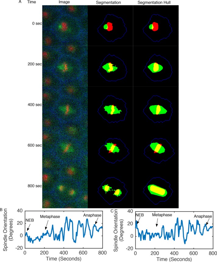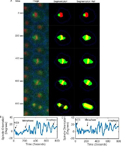 FIGURE 4:. Automated analysis detects spindle rotational oscillations. (A) A time series of mitosis in cells expressing mChe-H2B, GFP-Tub, and BFP-CAAX (left), with accompanying automatically recognized regions (middle) and the convex hull of those regions (right), output from the Spindlometer. (B) Manually and (C) automatically calculated plots of spindle rotation demonstrate rotational oscillations before anaphase onset.