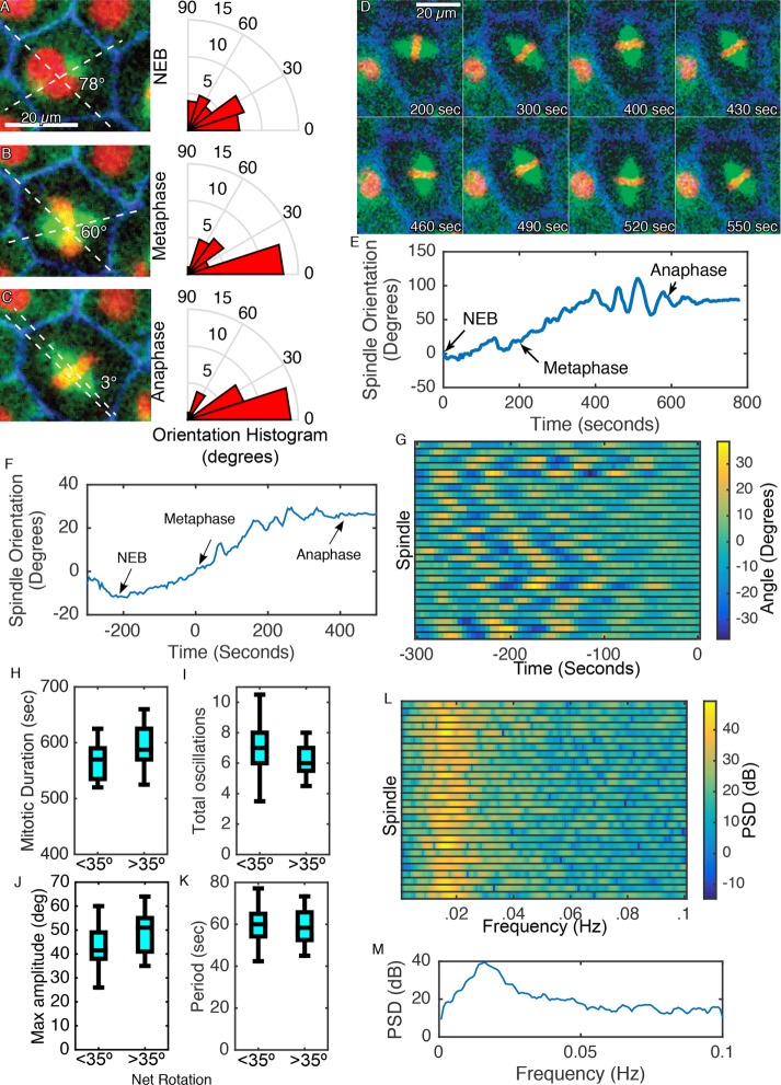 FIGURE 3:. Mitotic spindles display stereotyped alignment and oscillatory rotational dynamics. The angle between centrosomes/spindle poles and the long axis of the cell at anaphase was measured in 28 cells at (A) NEB, (B) metaphase, and (C) anaphase in cells expressing BFP-CAAX, GFP-Tub, and mChe-H2B. (D) Mitotic spindles display dynamic movement, featuring preanaphase oscillations when spindle orientation is plotted (E). (F) Average spindle orientation over time for 28 manually analyzed spindles. Time 0 indicates approximate time of metaphase plate formation. (G) Twenty-eight spindles all demonstrate rotational oscillations before anaphase onset (time 0). Spindles grouped by net rotation between NEB and anaphase onset show no significant difference in (H) mitotic duration, (I) total oscillations, (J) maximum amplitude of oscillation, or (K) periodicity of oscillation. (L) Power spectral density of corresponding spindle traces from G, indicating the oscillatory frequency of each spindle. (M) Average of PSDs from L, indicating a dominant oscillatory frequency of 0.01562 Hz (period of 64 s).