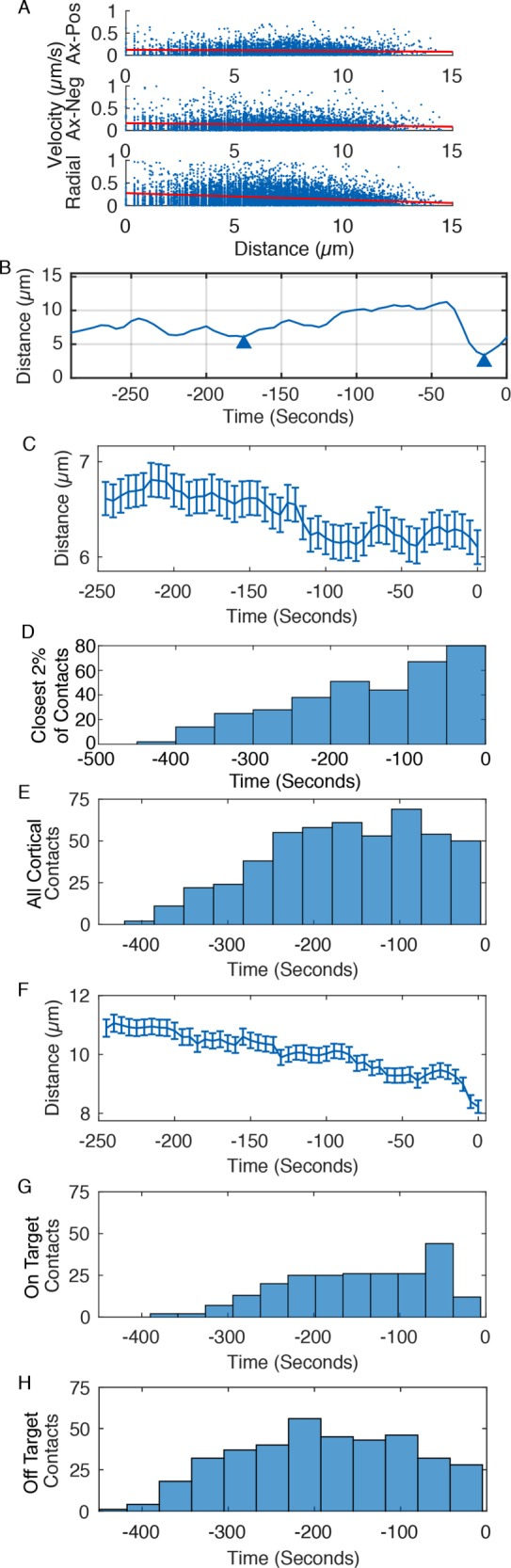 FIGURE 8:. Measurement of spindle–cortex interactions. For 100 spindles analyzed with the Spindlometer, spindle pole velocity was broken down into components parallel to (radial) or perpendicular to (axial) the nearest point on the cell boundary. (A) Linear fits to positive axial velocity, negative axial velocity, and nondirectional radial velocity against distance to cell boundary. Radial velocity is significantly greater than either axial component at the cell edge (p < 0.001). Negative axial velocity is significantly greater than positive axial velocity at the cell edge (p < 0.001). (B) Sample trace of distance between spindle pole and cell boundary. Triangles denote troughs where distance drops to <7 µm. C) Average distance of 200 spindle poles to cell boundary during metaphase. Time 0, anaphase onset. Error bars, SE. (D) For 200 metaphase spindle poles, histogram indicating the 2% of time points at which each pole was closest to the cortex, indicating a general increase in cortical contact through metaphase. (E) Timing of cortical contacts for 100 spindles during metaphase. A contact is constituted by proximity within 7 µm of the cell boundary followed by withdrawal by at least 2 µm. (F) For 200 spindle poles, average distance between the spindle pole and points on the cell cortex that fall along the anaphase axis. Time 0, anaphase onset. Error bars, SE. (G) Timing of on-target cortical contacts at the points on the cortex along the anaphase axis. Contact is constituted by proximity within 7 µm, followed by withdrawal of at least 3 µm. (H) Timing of off-target (unaligned) cortical contacts. Cortical contacts as defined in D were sorted to include only those that occurred at least 9.3 µm from the target point defined in G.